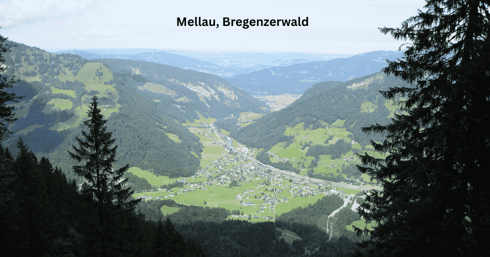 Mellau hat einen charmanten Dorfkern mit traditionellen Holzhäusern. Die Region ist sehr gepflegt. Cafés und kleine Läden laden zum Verweilen ein. Im Hintergrund ragen die Berge empor. Mellau vermittelt einen typischen Bregenzerwälder Charme.